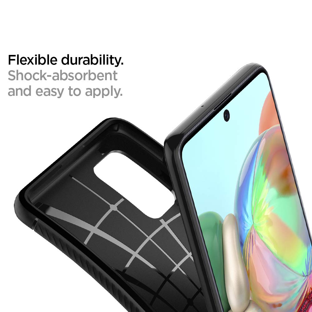 The Classic Rugged Armor series is now available for the new Galaxy A71. Packed with style, the signature look remains unchanged with a matte black finish and carbon fiber highlights. Air Cushion Technology is included in all corners for added protection against drops, while raised edges provides bolstered screen protection. Encase the new Samsung Galaxy A71 in a Rugged Armor for the perfect balance of defense and class.