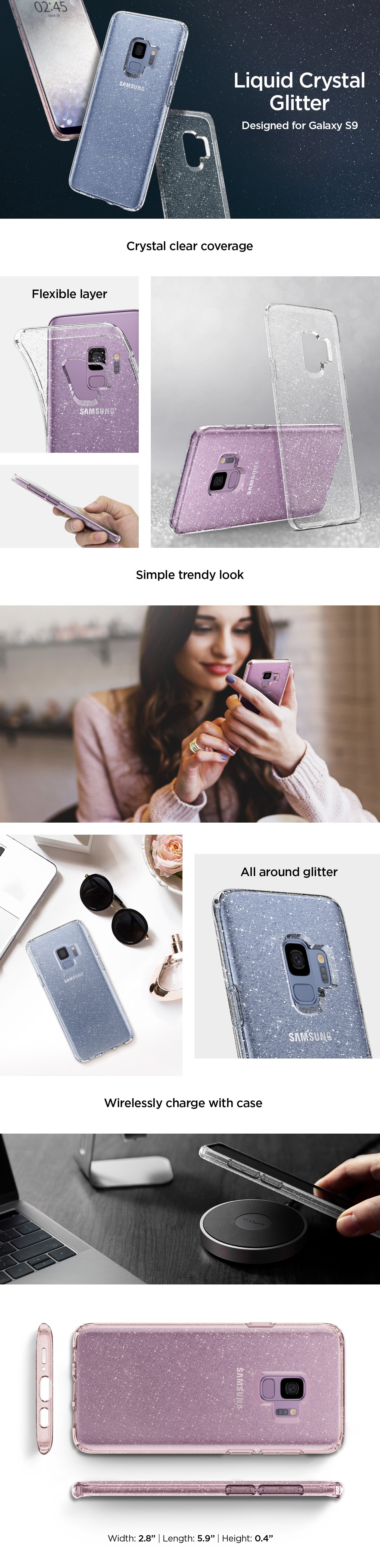Complement the look of the all-new Samsung Galaxy S9 with a little bit of sparkle. The Liquid Crystal® Glitter maintains the feel of the original device but with shine that brings mimics the look of an actual galaxy. An innovative dot pattern ensures to keep watermarks clear by preventing the back of the device from touching the case. All buttons and cutouts are made with utmost precision to maintain quick response and access. Show off the new Galaxy S9 in the Liquid Crystal® Glitter.