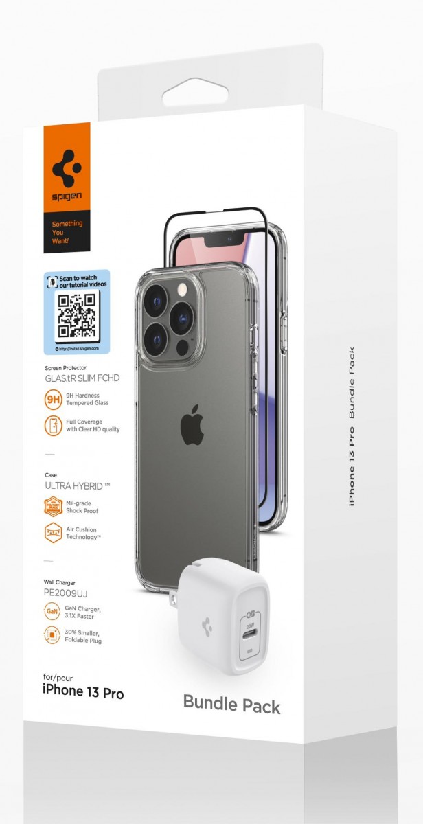 Spigen Bundle Pack for iPhone 13 Pro : Ultra Hybrid Case + Full Cover Tempered Glass + Wall Charger