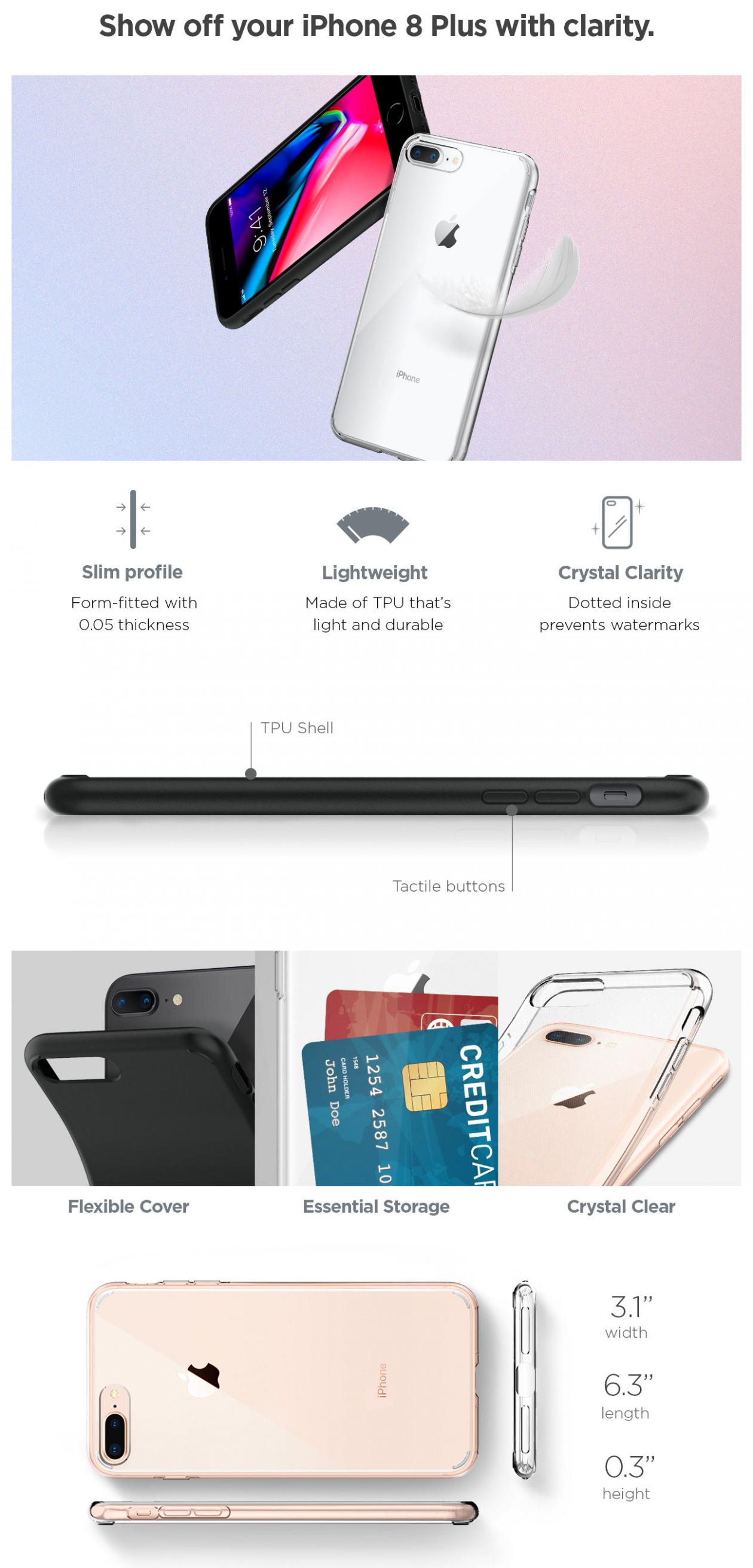 Display the all-new iPhone 8 Plus in all its glory with the protection it deserves. Liquid Crystal™ provides everyday drop protection with Air Cushion® Technology and a material shock-absorbent in nature. It is made of a clear layer of TPU with an innovative dot pattern to keep the back clear and watermark-free. Give the original look of the iPhone 8 Plus an upgrade with Liquid Crystal™.