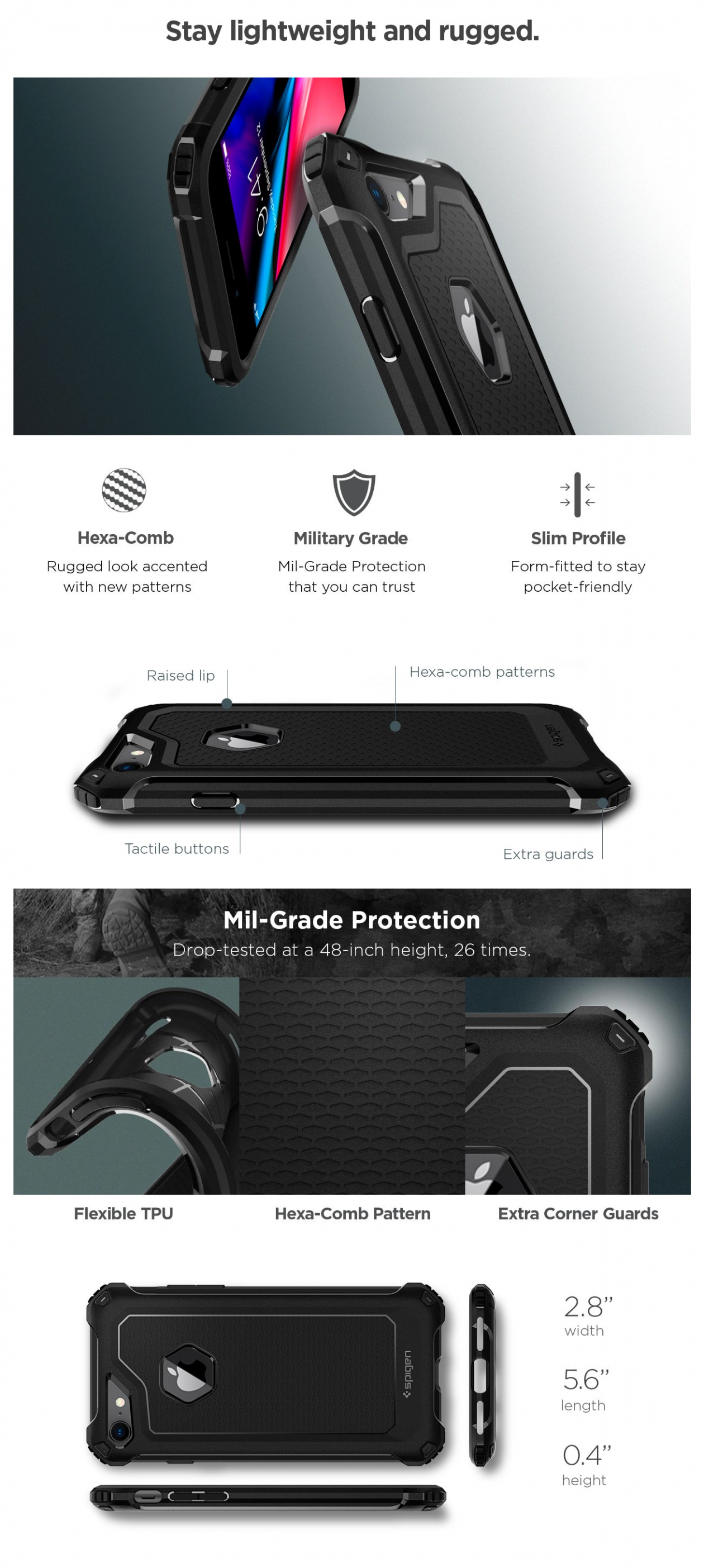 The all-new Rugged Armor Extra™ embodies streamlined design with supreme drop protection. All areas prone to impact are guarded with extra raise with minimum bulk. The simple layer is packed with shock-absorbency to leave important features contact-free and others completely haptic. Its back has a dynamic combination of Hexacomb and gloss detailing to add style to its rugged look. Add extra durability without the bulk with Rugged Armor Extra™.