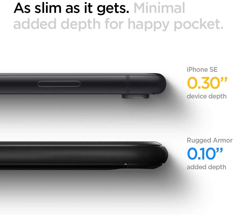 Inspired by car design, Rugged Armor® secures the iPhone SE in a timeless and streamlined body. Its slim frame is textured with carbon fiber detailing and subtle glossy accents.