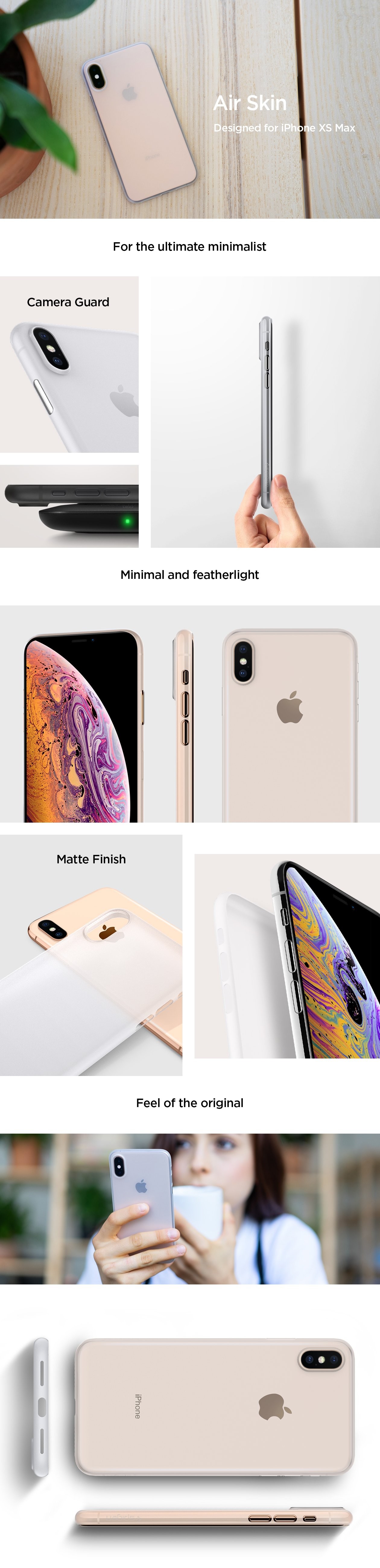 Preserve the ultimate look and feel of the all-new iPhone XS Max with AirSkin®. Its thin, semi-transparent layer offers a clean matte finish with everyday scratch defense. Its unbelievable slimness only adds 0.3 inches support everyday portability and wireless charging. Enjoy the ultimate minimalism for the new iPhone XS Max.