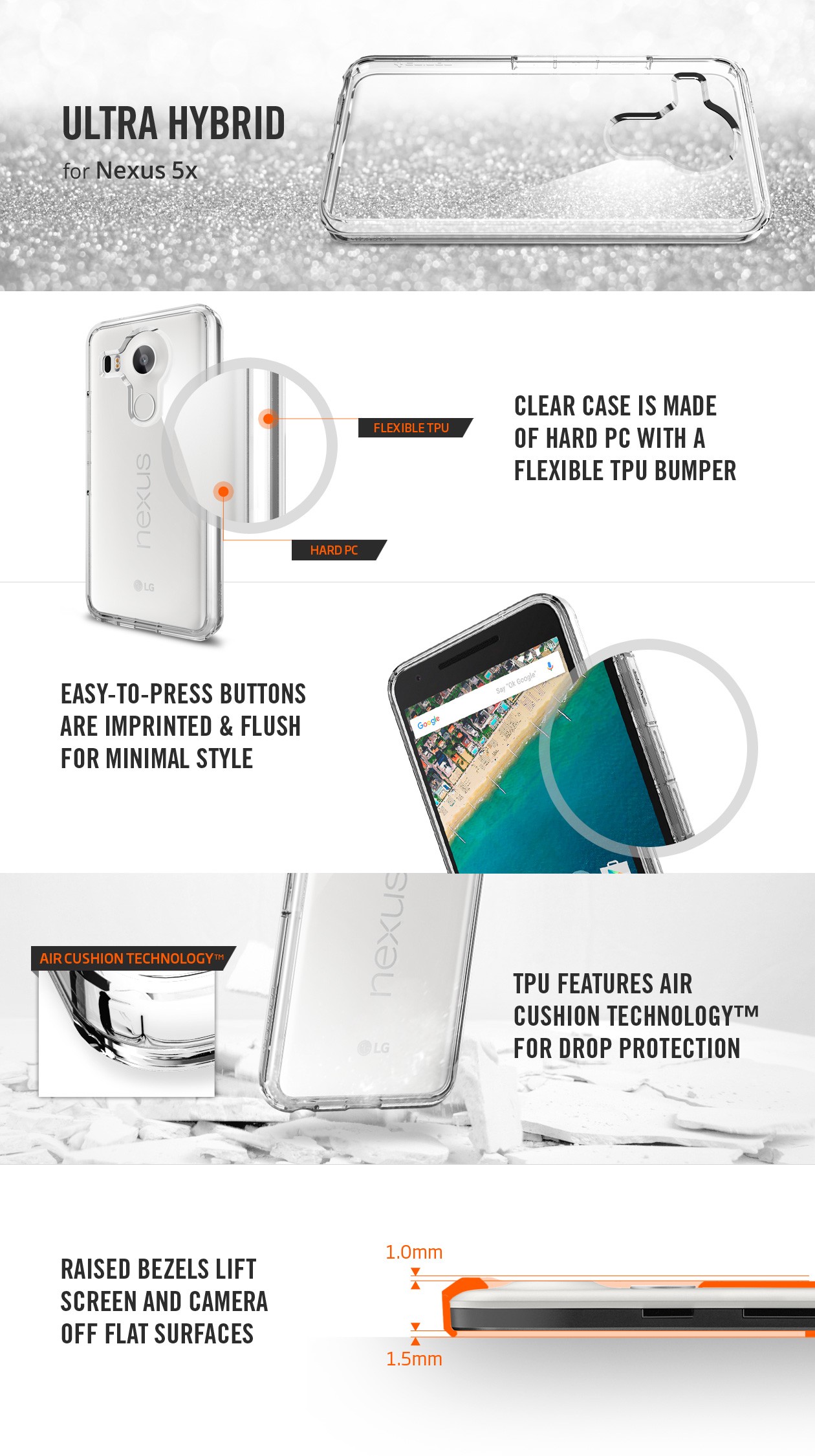 Let our Ultra Hybrid™ case protect your Nexus 5x in clear transparency. The hard PC back and flexible TPU bumper are equipped with Air Cushion Technology™ to protect against small drops. Its pronounced buttons are recognizable at the touch and easy to press for the perfect day-to-day case.