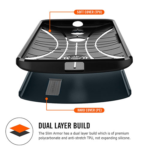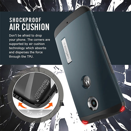 Slim has never been stronger. The Slim Armor™ case for the Nexus 6 provides complete all-around protection while maintaining a slim profile. The Slim Armor is double layered with a TPU case and a polycarbonate hard case to provide additional protection in a form-fitted design. The case features a completely reimagined designed to complement the Nexus 6's smoother edges. The buttons are now flush with the case with embossed glossy symbols for a refined look and comfortable experience. The bezel has a subtle glossy accent for a sophisticated look and better grip. The TPU case features Air Cushion Technology corners allowing shock absorption from external impact. The 4-Point Rear Guard protects the metallic finish backplate by lifting the backplate above the surface.