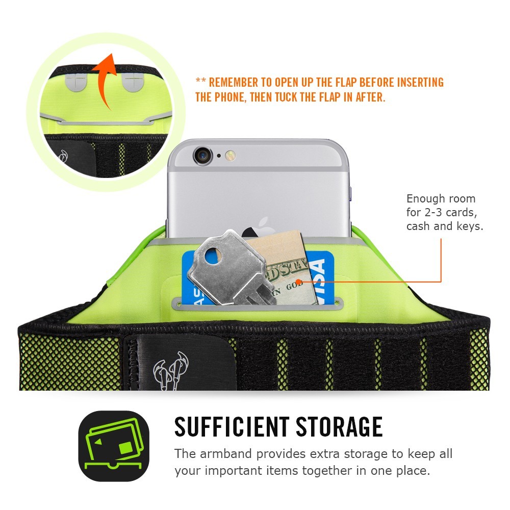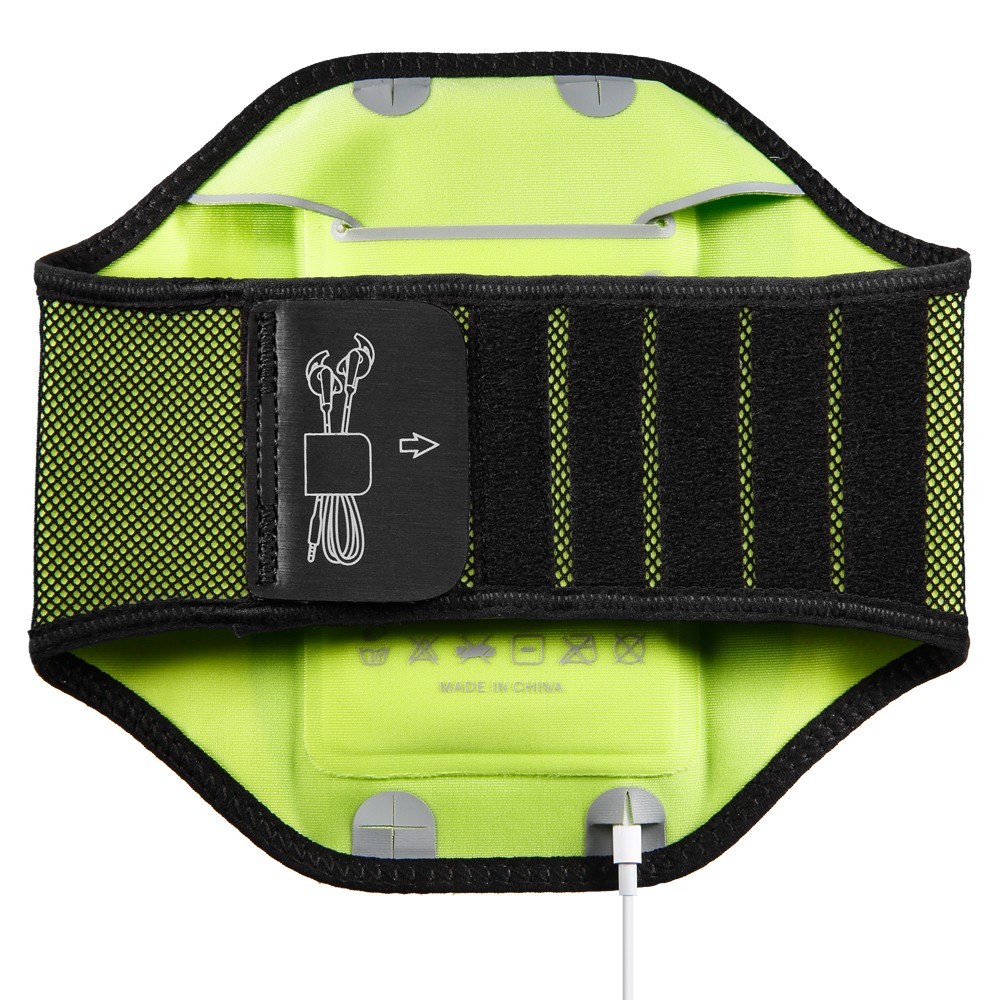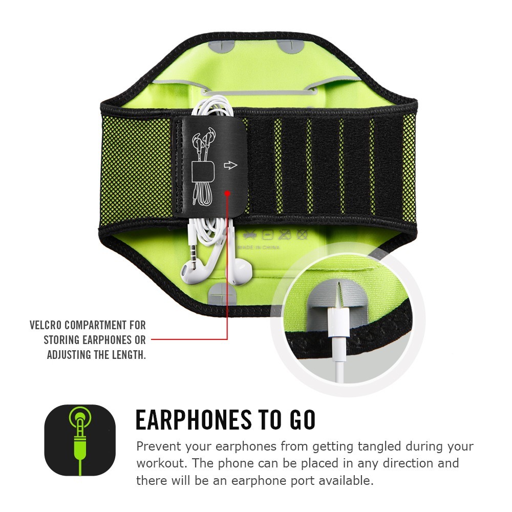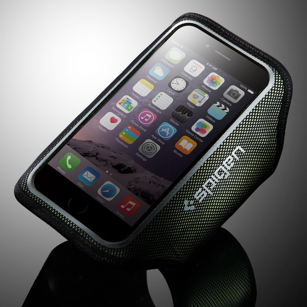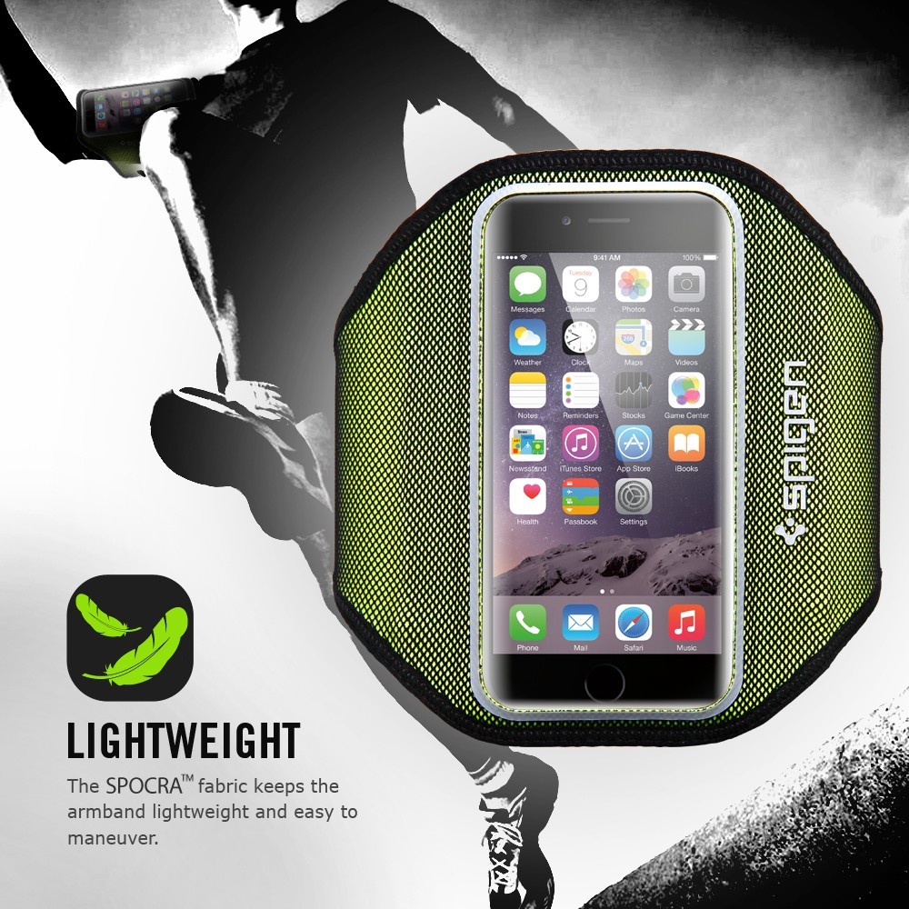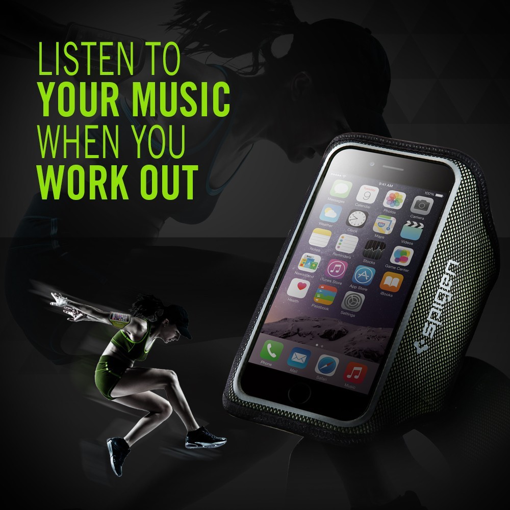 Get music on the go. The Spigen armband is made with SPOCRA™ for superior comfort during workouts. SPOCRA™ is a fast-dry elastic fabric that stretches to form fit the user. The armband is adjustable using a versatile velcro strap which also doubles as a length adjusting clasp for earphone wires. The interior of the armband features a storage compartment for cards, cash, and keys.