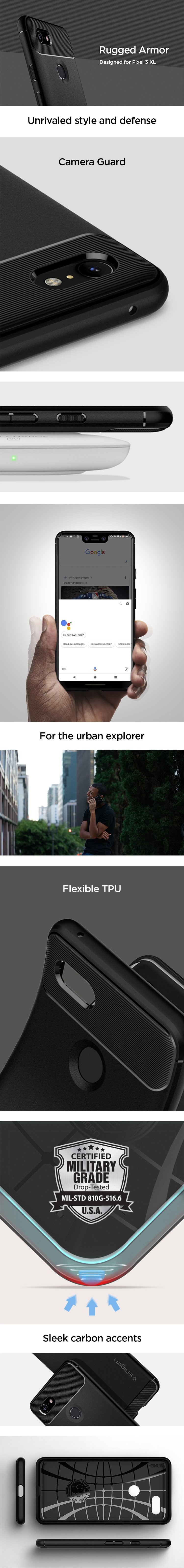 Slim and modern, the Rugged Armor® for the Pixel 3 XL packs extreme protection in a single layer. Its matte black finish and carbon fiber highlights add style to the sleek device. All four corners are packed with Air Cushion Technology® to ensure optimum shock-absorption in every drop. Wireless charging is fully supported by the ergonomic design while precise cutouts offer easy access to every feature. Encase the Pixel 3 XL with unrivaled style and defense.