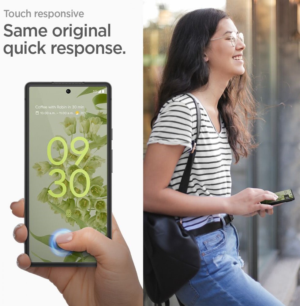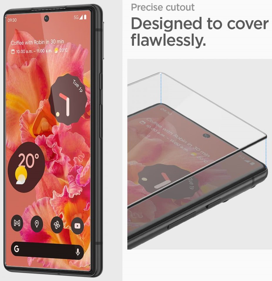 Spigen GLAStR ALIGNmaster Full Cover for Google Pixel 6 is specially made with reinforced scratch resistant Tempered Glass & offers nearly Full coverage of the front screen with a black border frame that mimics original Pixel 6 design. The Protector is manufactured a fraction smaller leaving just enough room on the edges to allow installation of most covers without problem as long as the case / cover is not touching / pushing up the protector. With 9H hardness rating, ROUNDED EDGES, the GLAStR provides premium protection, absolute Clarity, absolutely NO LOSS in Touch Screen Sensitivity (Feels like touching the original screen) and is in-screen Finger Print Sensor Compatible.