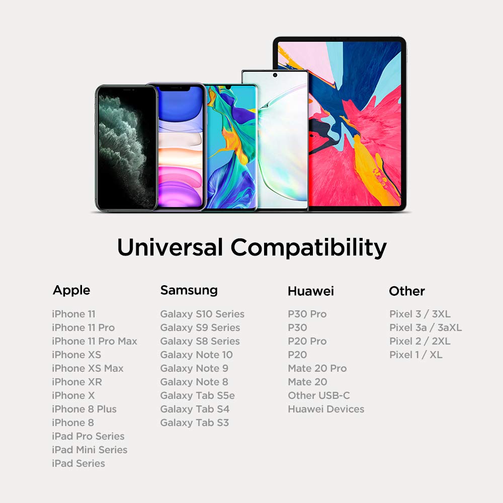 - Compatible with iPhone 11, 11 Pro, 11 Pro MAX, XR, XS, XS MAX, 8, 8 Plus, 7, 7 Plus, Samsung Galaxy S10, S10 Plus, S10E, S9, S9 Plus, S8, S8 Plus, S7, S7 Edge, Note 10, 9, 8, Google Pixel 3a XL, 3a, 3 XL, 3, 2 XL, 2, OnePlus, iPads, AirPods, Galaxy Buds